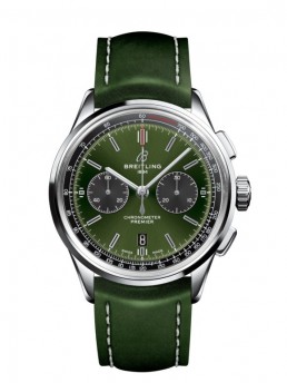 Il modello Premier B01 Chronograph 42 Bentley British Racing Green omaggia la partnership di lunga data tra Breitling e Bentley Motors, il produttore delle automobili di lusso più ammirate al mondo. In precedenza Breitling for Bentley era presentato come brand di nicchia separato dalla collezione Breitling, ora questo modello e le future edizioni limitate Bentley saranno presentate nelle attuali famiglie della collezione Breitling. L’orologio monta un Calibro di manifattura Breitling 01, visibile attraverso il fondocassa trasparente, e vanta ben 70 ore di riserva di carica. Con uno straordinario quadrante British racing green, si abbina a un bracciale in acciaio oppure a un cinturino in pelle British racing green, in tinta con il quadrante. I contatori a contrasto sono situati a ore 3 e a ore 9, mentre la finestrella della data è posta a ore 6. Sul lato sinistro della cassa è incisa la scritta Bentley, ispirata al cruscotto della «Blower» Bentley del 1929, e il fondocassa trasparente è decorato con il logo Bentley metallizzato.