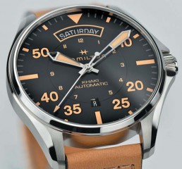 L’HAMILTON Khaki Pilot Day Date Auto si pone al pubblico in una veste che rispetta appieno le radici aeronautiche del brand e che soddisfa i requisiti fondamentali richiesti a ogni orologio da aviatore: cassa 42 mm compatta e robusta fornita di una prominente corona scanalata; quadrante scuro sul quale far risaltare le informazioni orarie e ampiamente trattato con materiale luminescente per garantire leggibilità ottimale anche al buio; cinturino/bracciale solido e resistente; movimento di massima affidabilità e precisione. Tra novità e rimandi l’orologio conferma l’American Spirit & Swiss Precision che contraddistingue i segnatempo Hamilton.
