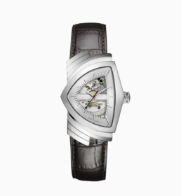 Se amate le versioni scheletrite, Hamilton offre una versione automatica del Ventura declinata in due modelli/colore. Parliamo del VENTURA AUTO, affascinante segnatempo che unisce l’originale quadrante triangolare a cinturini in pelle dalla connotazione vintage e un’anima a vista: dal vetro zaffiro è possibile vedere il movimento H-10.