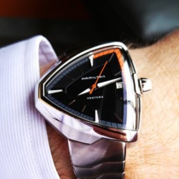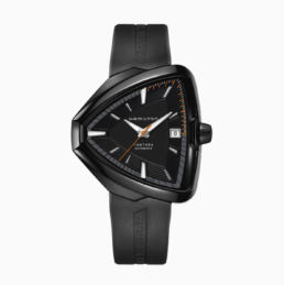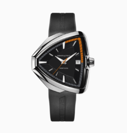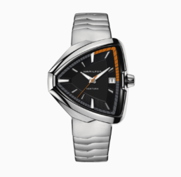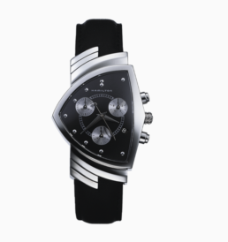 Tutti lo conoscono ma in pochi lo sanno: l’orologio Hamilton ventura è il primo orologio elettrico a batteria al mondo. Nato nel 1957, declinato al femminile solo successivamente, questo segnatempo continua a conquistare gli appassionati grazie al un design accattivante e riconoscibile. Merito del grande cinema che l’ha immortalato sul polso di uno dei miti del secolo scorso, Elvis Presley, che lo indossò sul set di Blue Hawaii (1961). Questo modello dalla forma di uno scudo asimmetrico (ispirato alle code delle Chevrolet di quei tempi), fu di totale rottura per quegli anni, perché era il primo orologio elettronico della storia. Il fatto che un personaggio così famoso lo avesse scelto fu un volano incredibile per il brand e portò il Ventura a entrare nel ristretto club degli orologi leggendari. Per Hamilton rappresentò il primo approccio a Hollywood, che negli anni diventò sempre più stretto e costante: non si contano i film in cui un suo orologio è apparso sul grande schermo. Qualche esempio? 2001: Odissea nello Spazio di Stanley Kubrick, Interstellar di Christopher Nolan, The Martian di Ridley Scott. E il blockbuster Men in Black: proprio al polso delle due star della saga, Will Smith e Tommy Lee Jones, il Ventura è tornato in grande stile in un film. Nel 2015, in quello che avrebbe dovuto essere l’80esimo compleanno di Elvis, Hamilton ha presentato la collezione Ventura Elvis 80, formata da un modello con movimento automatico e uno al quarzo.