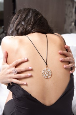 Anello in oro rosa e diamanti con motivo floreale. Collana in corda con pendente Pomellato in madreperla e oro giallo interscambiabili..