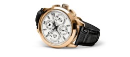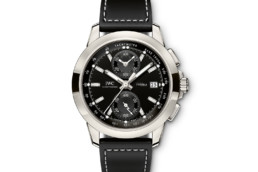 Nero e titanio fanno invece dell’Ingenieur Chronograph Sport (ref. IW380901) un concentrato di spirito vintage e sobrietà. Disponibile in edizione limitata di 500 esemplari, l’orologio è mosso dal calibro di manifattura IWC 89361, ha la cassa da 44 millimetri in titanio, il quadrante nero e il cinturino nero in pelle di vitello. Curiosa è la lancetta dei piccoli secondi a «ore 6» dallla forma di un fulmine stilizzato: un’allusione al fatto che il movimento è protetto dai campi magnetici tramite una gabbia in ferro dolce.