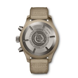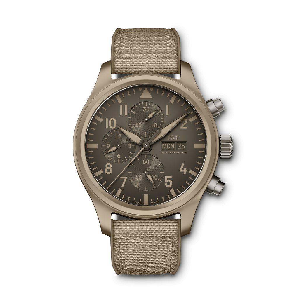 Con cassa esterna in ceramica e un diametro di ben 44.5mm, il nuovo PILOT’S WATCH CHRONOGRAPH TOP GUN EDITION «MOJAVE DESERT» (referenza IW389103) affascina per le sue sfumature perliscenti ottenute della combinazione tra l’ossido di zirconio e altri ossidi metallici.