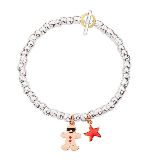 Bracciale kit con granelli in argento, con ciondolo omino pan di zenzero oro rosa 9 kt e smalti colorati e con ciondolo stella marina in oro rosa 9 kt e smalti corallo. La chiusura del bracciale presenta un anello brisè in oro giallo 18 kt.