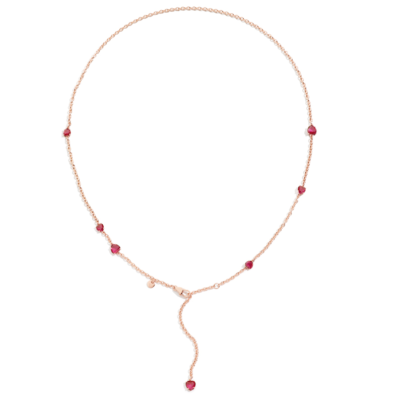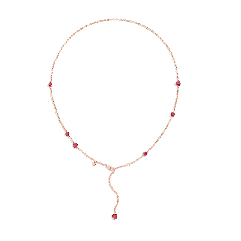 oro rosa nove carati con cuori in rubino sintetico. Lunghezza cm 60 – Vestibilità cm 52 – 54