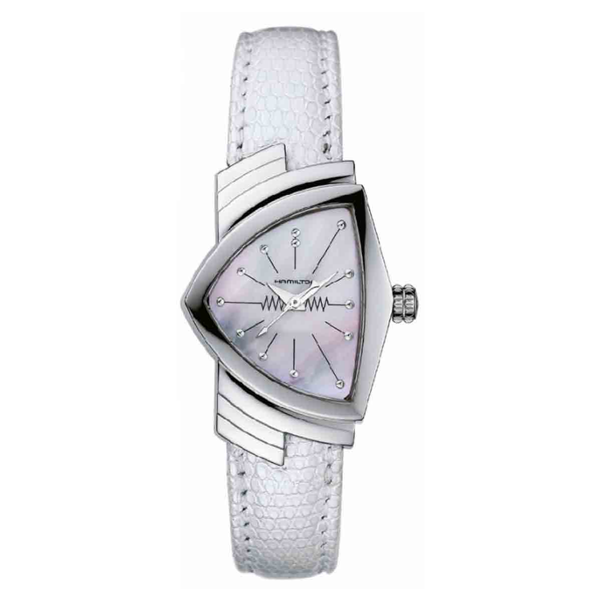 I dettagli della cassa sono fedeli a quelli dei suoi antenati. Il quadrante rispetta le caratteristiche dei Ventura degli anni ’50, con gli indici che terminano in piccoli punti rotondi che ricordano la forma degli atomi.