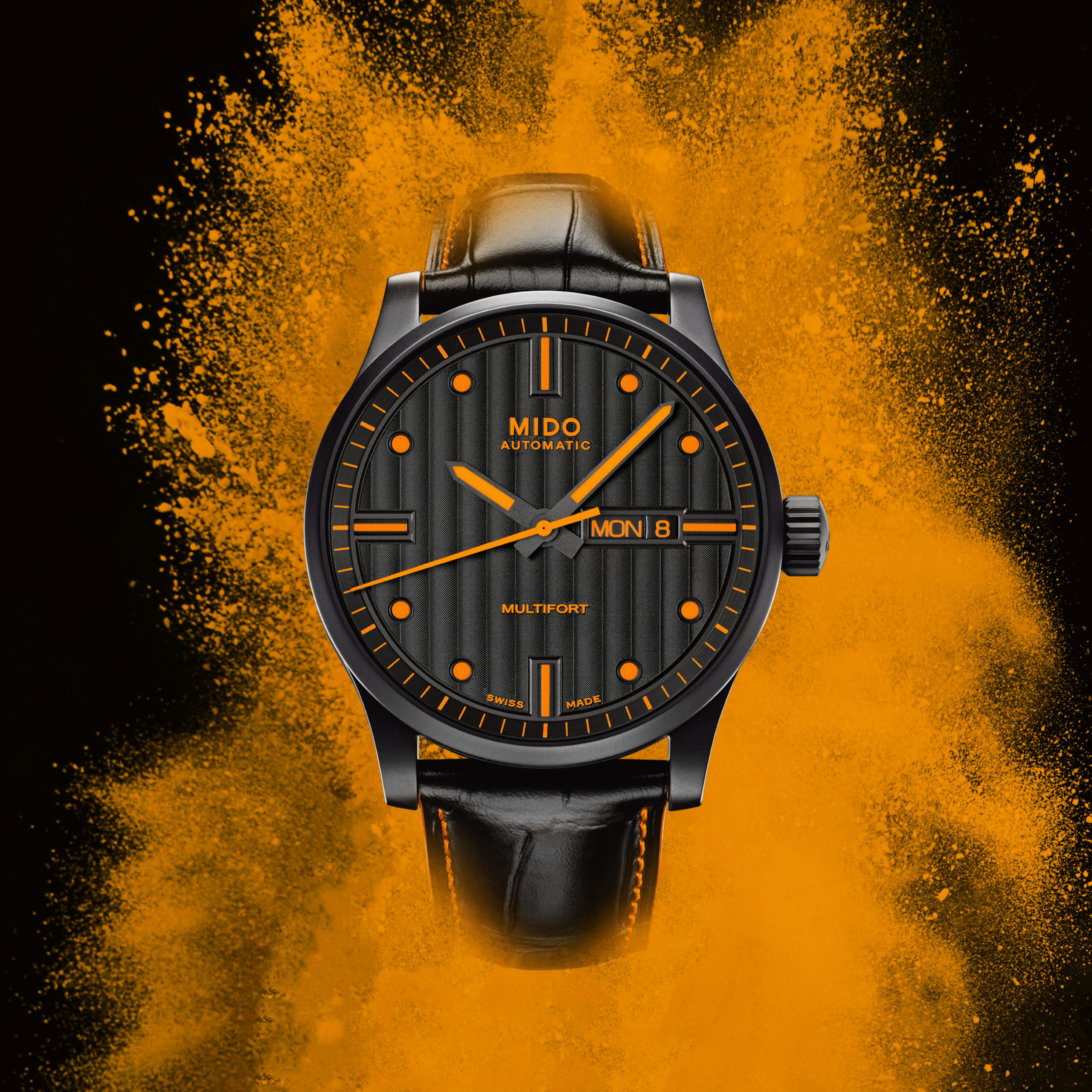 L’orologio Multifort Special Edition è dotato di un look di grande impatto, grazie al quadrante nero e agli elementi applicati e le lancette color arancio. Il movimento automatico Caliber 80 conferisce all’orologio un’autonomia eccezionale. Il segnatempo ha in dotazione due cinturini Mido intercambiabili, nero e arancio.