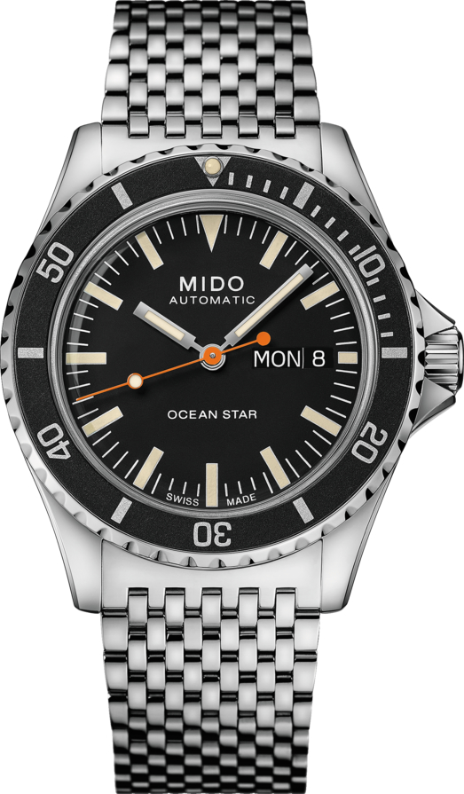 Mido rende omaggio alla collezione Ocean Star per i suoi 75 anni. Ispirandosi al passato, l’Ocean Star Tribute reinterpreta i codici estetici dei modelli da immersione degli anni Sessanta del Novecento e ne riprende tutti i segni particolari: è dotato di un movimento automatico Calibro 80, impermeabile fino a una pressione di 20 bar (200 metri), e il suo bracciale esclusivo conferisce all’orologio un confort assoluto.