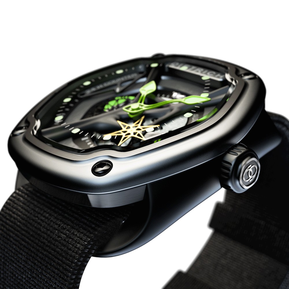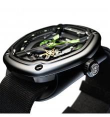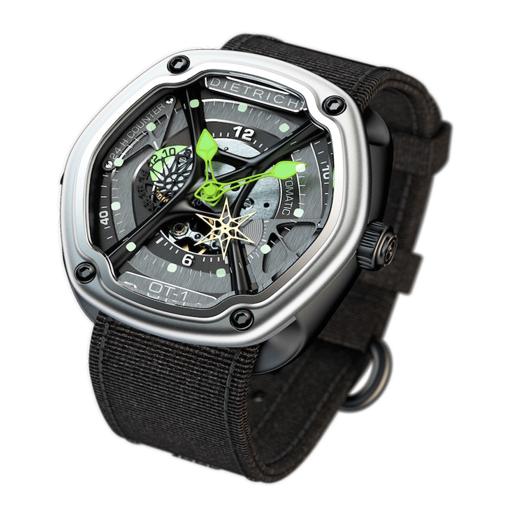 Ultimo nato in casa Dietrich, questo orologio è dotato di una cassa in acciaio di forma ovale rivestita con PVD nero (48x 49 millimetri) e anse nascoste che permettono al cinturino di passare sotto il fondello.  Il movimento è un calibro automatico Miyota rivisto e migliorato per un orologio dal carattere forte e seducente.