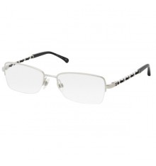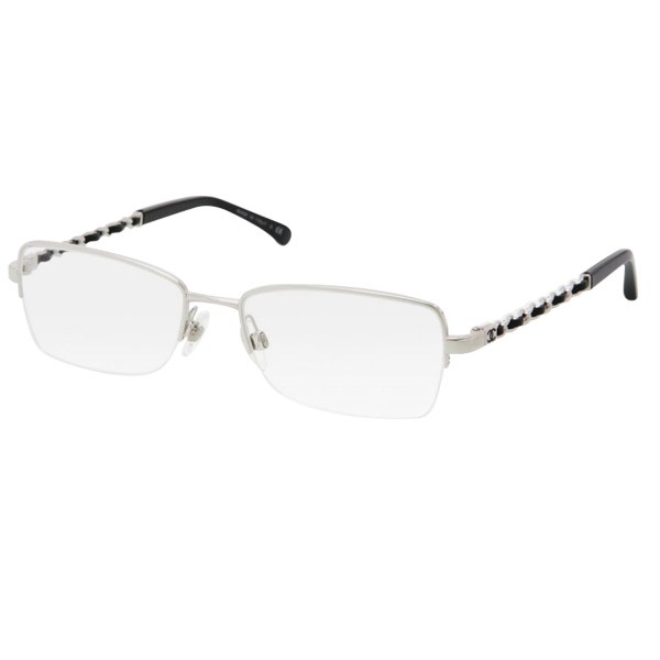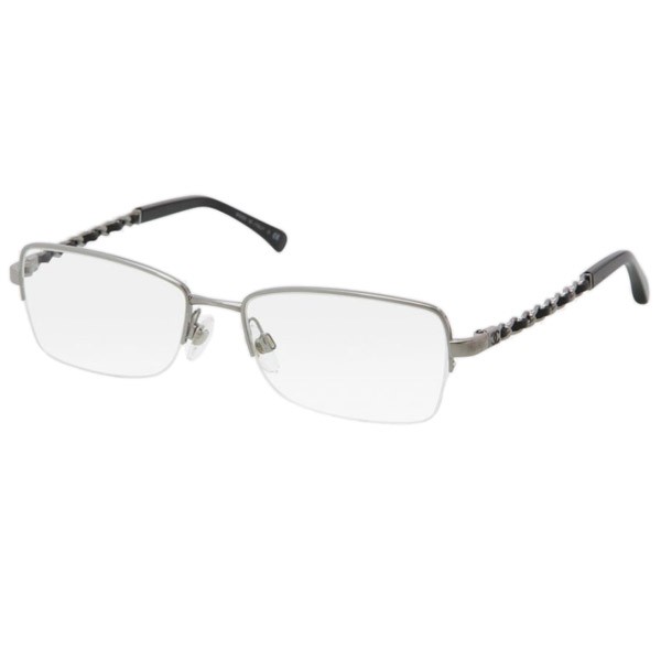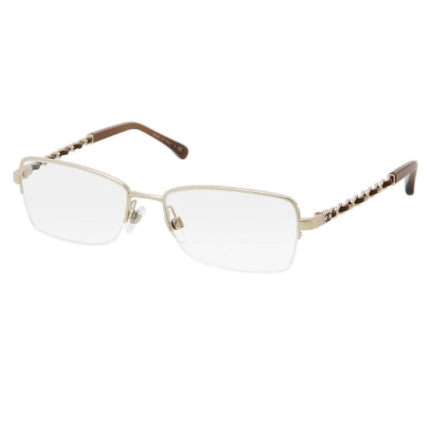 Montatura rettangolare, astine fini in catena intrecciate di pelle con logo CC in vernice.