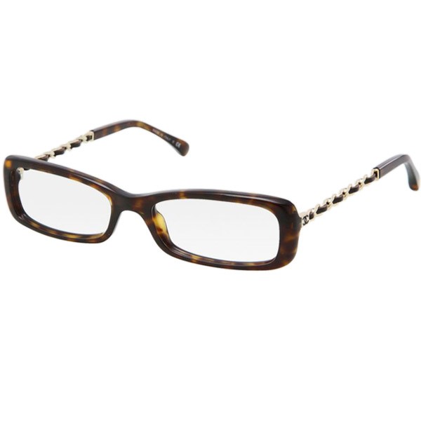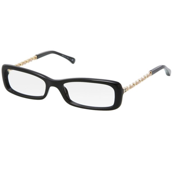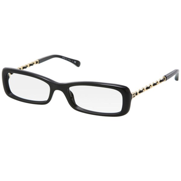 Montatura rettangolare in acetato, astine fini in catena intrecciate di pelle con logo CC in vernice.